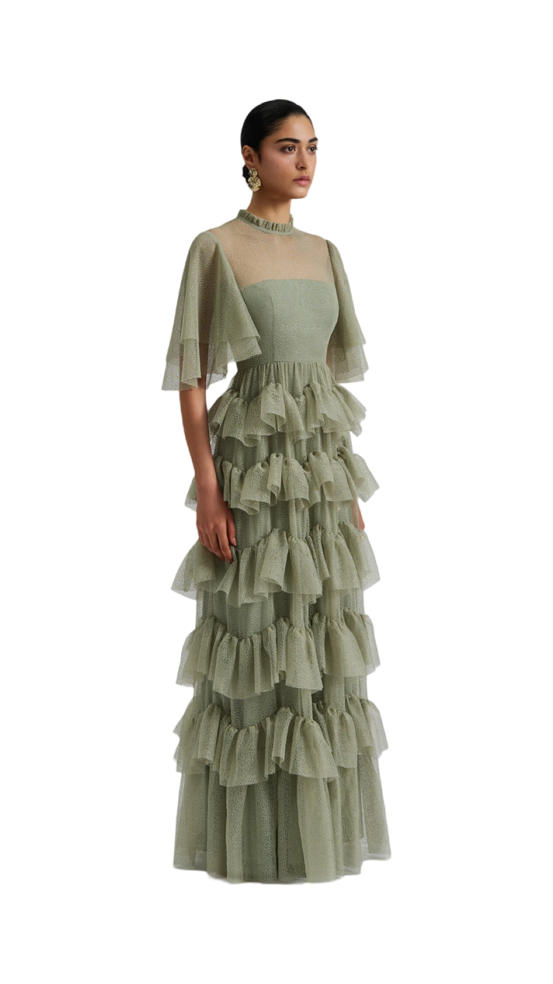 Tulle sage colored gown. Shell 100% nylon, linning 97% polyester 3% spandex